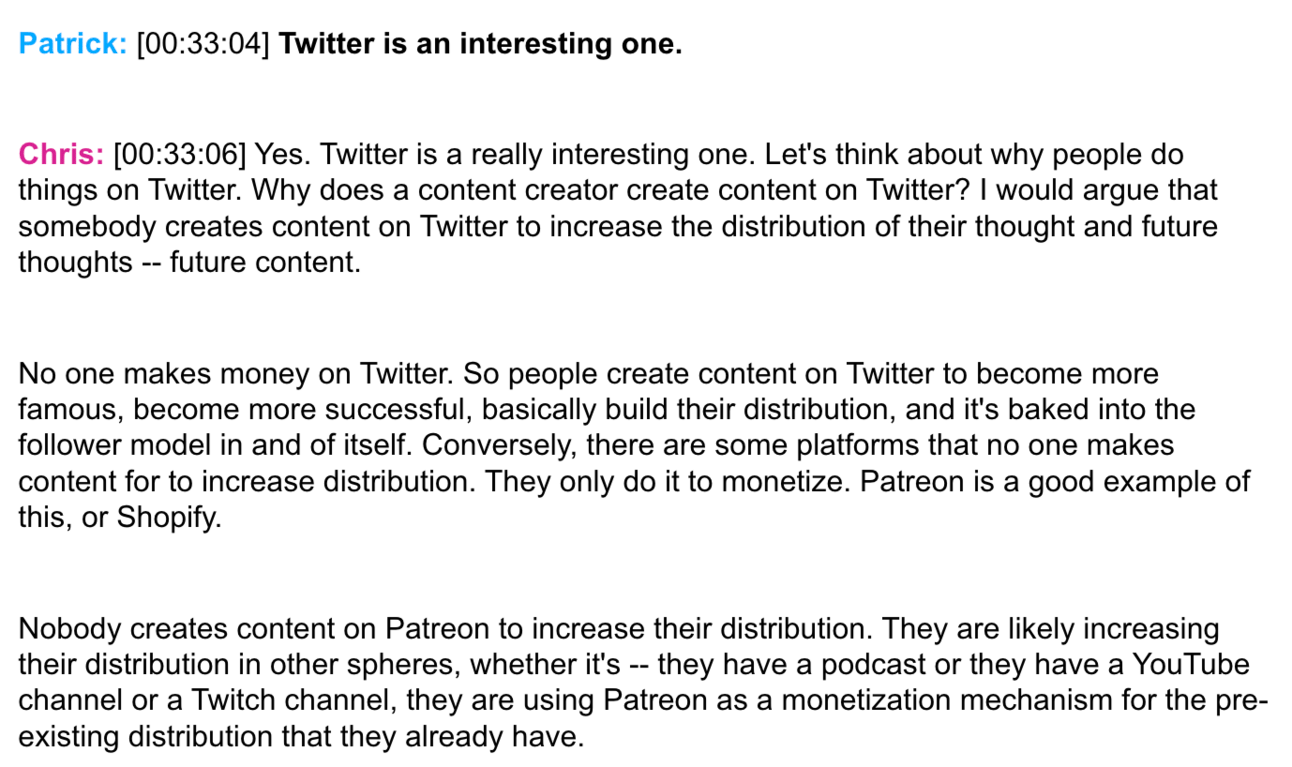 There are two sides of content creation - distribution (gaining attention) and monetization (utilizing that attention). I’ve spent a lot of time thinking about this after listening to Chris Paik on Invest Like the Best, specifically this passage: